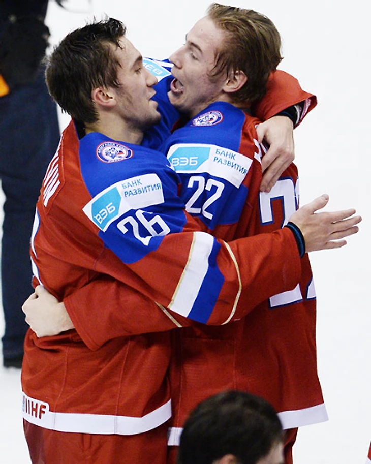 Николай Голдобин (слева) и Владислав Каменев празднуют только что организованную четвертую шайбу в ворота сборной Канады. В тот момент казалось, что ничья уже совсем близко.