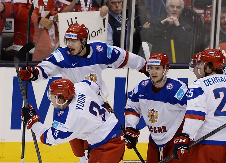 Шайба Дмитрия Юдина (под номером 3) вернула сборную России в финальную игру. Этот гол был первым набранным очком для защитника на МЧМ-2015.