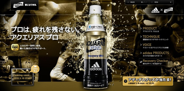 Энергетический напиток от Coca-Cola и Adidas. Coca-Cola предложила идеальное решение — напиток, с высоким содержанием биоактивных пептидов — антиоксидантов, которые широко применяются в омолаживающей косметологии. Aquarius Pro не только поможет получить заряд бодрости после изнурительной тренировки, но и поможет организму более эффективно обновлять клетки, а значит, всегда оставаться юным.