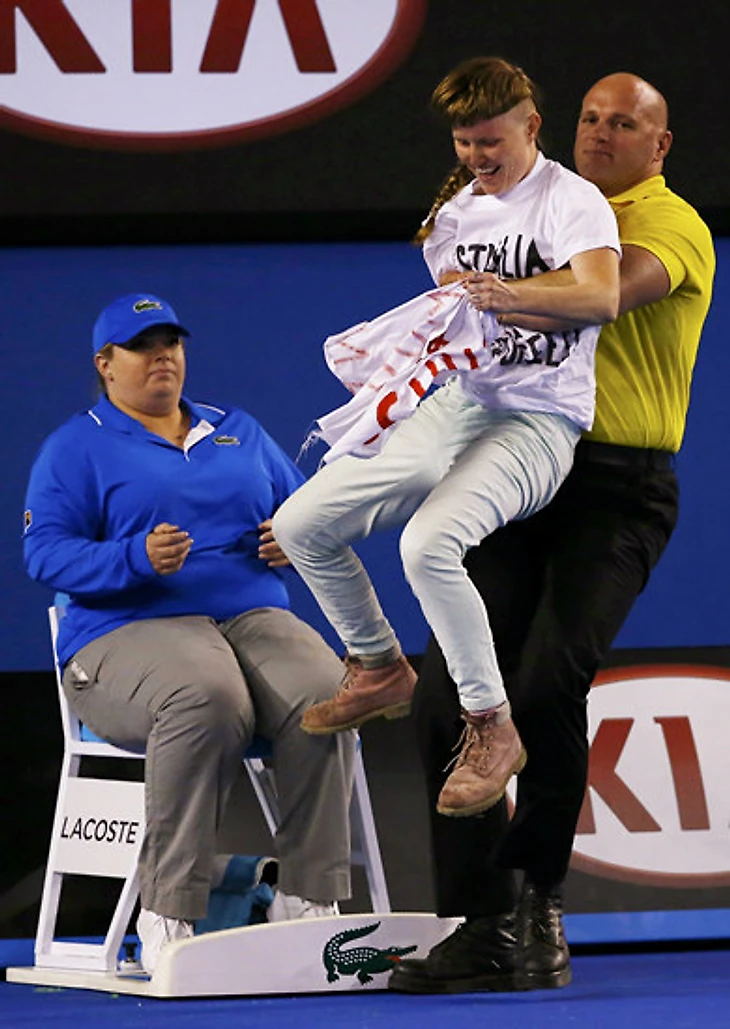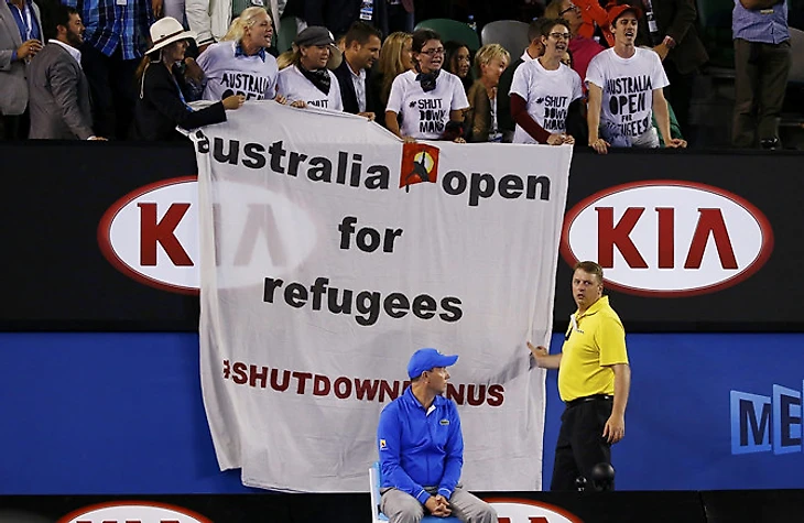 И так драматичному мужскому финалу добавили огоньку люди, устроившие протест против политики руководства Австралии в области центров для беженцев. В последние годы их стали активно сокращать, а беженцев отправлять на острова. Отсюда и лозунг протеста: «Австралия, открытая для беженцев».