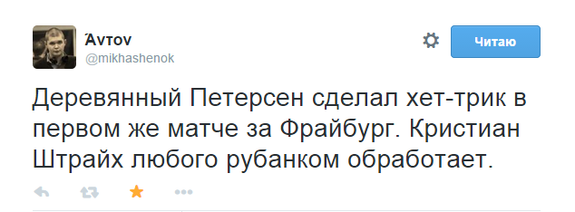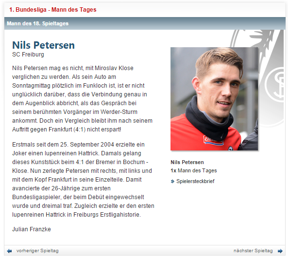 Однако Нильс Петерсен затмил собой всё, что только можно. На его фоне даже положительное решение о строительстве нового стадиона во Фрайбурге выглядит незначительным и местечковым событием. За 45 минут игрового времени нападающий, когда-то купленный «Баварией», вышел на второе место в списке бомбардиров в своей новой команде. Его опережает только Владимир Дарида – мотор, сердце и исполнитель пенальти «брайсгау».
