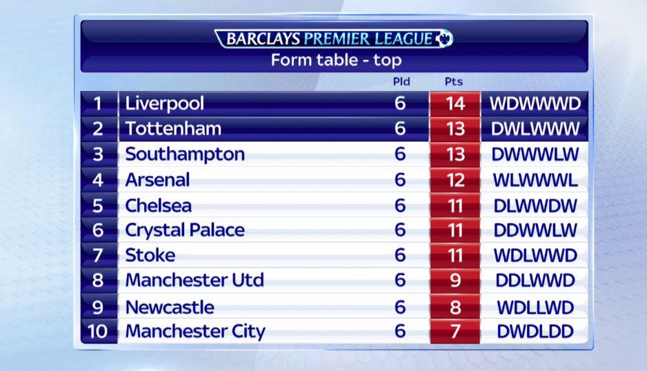 Один только момент: у "Ливерпуля" все же форма лучше, 14 очков в последних 6 матчах, 2-3 место делят "Саутгемптон" и "шпоры". В целом, у тебя все правильно, но я решил внести ясность до конца :)