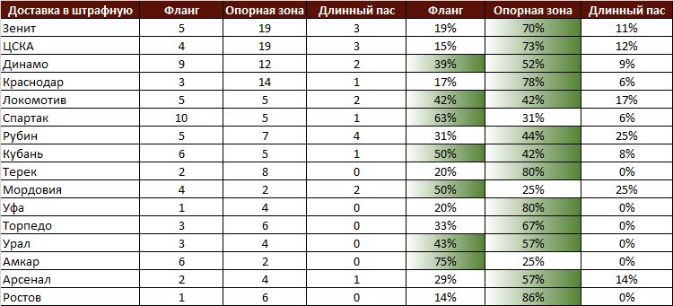 Как видим, чаще всего доставка мяча в штрафную (за счет паса или ведения) выполнялсь из опорной зоны. Игроки «Краснодара» чаще всего доставляли в атаках, которые привели к голу после ведения из центральных зон напротив штрафной (9 голов). «Динамо», «Локомотив» и «Кубань» наиболее вариативны. Выделяется, что большинство голевых атак «Спартака» после передач в штрафную с фланга. Аналогично характерно для «Амкара».