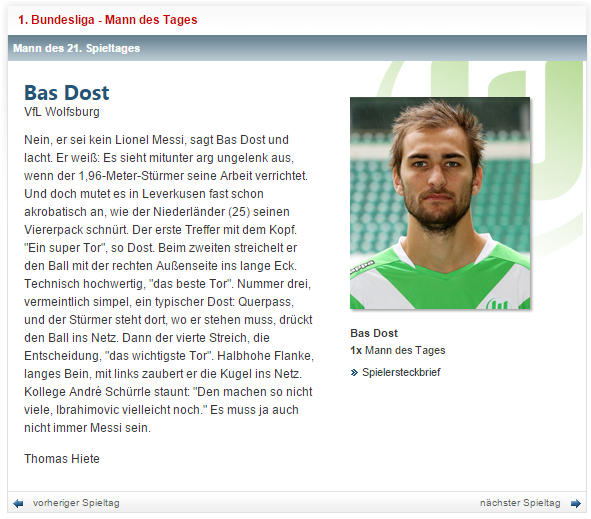«Байер» и «Вольфсбург» играют самый зрелищный матч выходных в Европе; «Бавария» унижает «Гамбург» в Мюнхене; «Боруссия» Д продлевает контракт с Марко Ройсом и побеждает «Майнц»; «Вердер» выигрывает пятый матч подряд и останавливается в шаге от еврокубковой зоны; «Хоффенхайм» и «Боруссия» М вырывают победы в своих матчах в добавленное время; Томас Шааф в юбилейном матче обыгрывает «Шальке»; «Фрайбург» убегает из зоны вылета; «Падерборн» набирает первые очки во втором круге – в Бундеслиге сыгран 21 тур