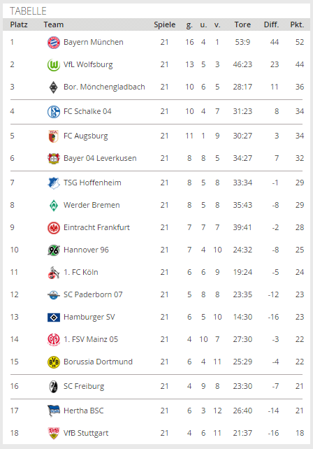 Если бы чемпионат заканчивался сегодня, то в Лигу Чемпионов попадали – «Бавария», «Вольфсбург» и «Боруссия» М; квалификация Лиги Чемпионов – «Шальке». Лига Европы – «Аугсбург» и «Байер».