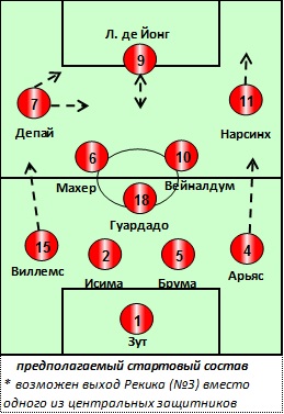 Депай чаще всего стремиться сам войти в штрафную или сместиться в центр и выполнить проникающую передачу в штрафную или удар из опорной зоны. Нарсинх обычно уходит в центр реже - если совсем нет возможности войти в зону подачи. Сместившись в центр он переводит мяч на центрального полузащитника и сам при этом выполняет рывок в штрафную. При рывках нападающего с фланга в центр, Де Йонг старается как бы выдернуть одного из центральных защитников, выполняя рывок в направлении игрока с мячом. Опасны в данном случае забегания в штрафную центрального полузащитника.