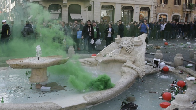 Подданные короля Виллема-Александра, закидав по дороге бутылками и петардами витрины магазинов, устроили пирушку на Площади Испании. Когда через несколько часов полиции удалось разогнать фанатов, Piazza di Spagnaпредставляла собой печальное зрелище. Урны перевернуты, мостовая усыпана битым стеклом и объедками и, что самое отвратительное, осквернению подвергся известный во всем мире фонтан XVII века Barcacciaработы Лоренцо Бернини.