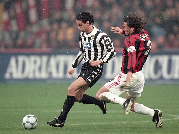 Паоло Мальдини не пускает к мячу будущего одноклубника Филиппо Индзаги