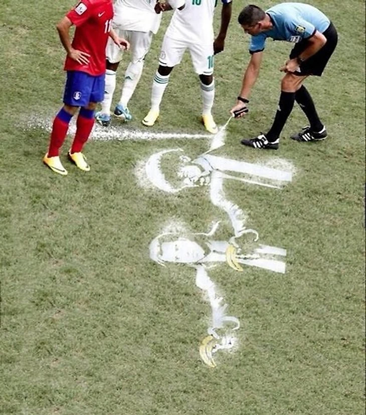 В странах Южной Америки (до того, как использовать на ЧМ-2014, вещество успешно прошло тестирование в матчах Кубка Либертадорес) без спрея уже немыслим ни один матч. Причем необходим он не только для усмирения пылкого нрава местных игроков, то и дело пытающихся спорить с судьей. Вот как оригинально выразил свое уважение в проводившему прощальный матч Алексу де Соузе бразильский мастер газонного граффити.