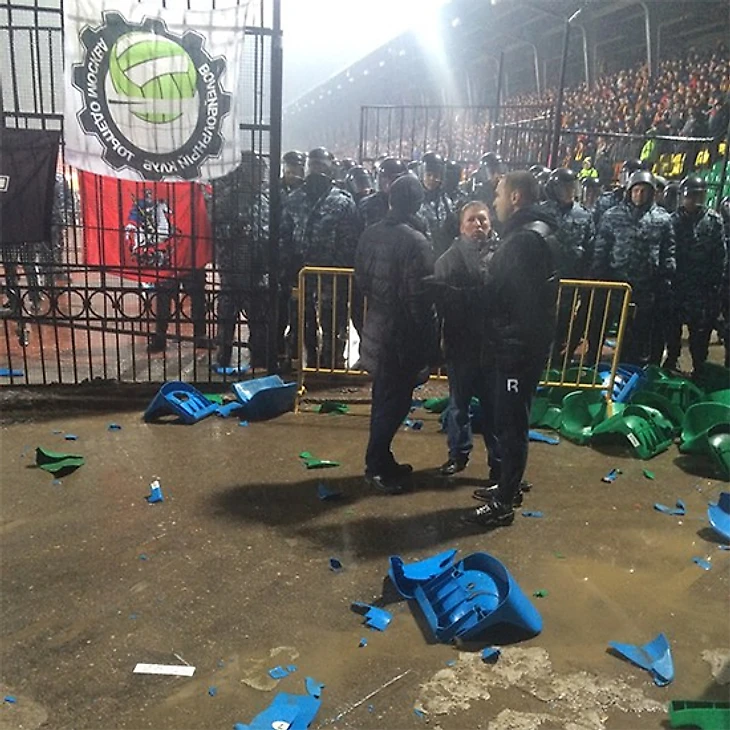 Подобное могло случиться еще в первом матче этих команд, но вовремя вмешались омоновцы. В Туле фанаты московского клуба все же добились своего. Болельщик «Торпедо» выбежал на беговую дорожку, его попытались задержать, но другие обитатели гостевого сектора бросились отбивать своего. Полетели петарды, встреча была прервана. 15 фанатов гостей задержали.