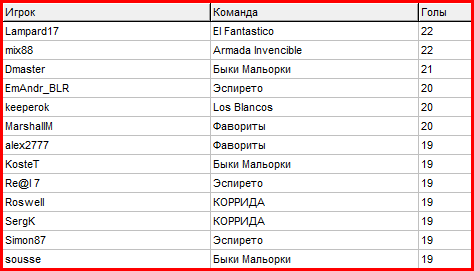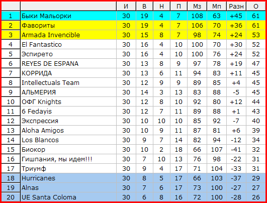 В 30м туре лидеры турнира "Быки Мальорки" проиграли свой матч, а их преследователи "Фавориты" выиграли и сравнялись по очкам. Только у "Быков" разница мячей больше. Интрига возвращается в нашем турнире. Не могу не отметить команду "Гишпания! Мы идем!", которые наконец вышли из опасной зоны. Но впереди еще 8 туров, всё может изменится.