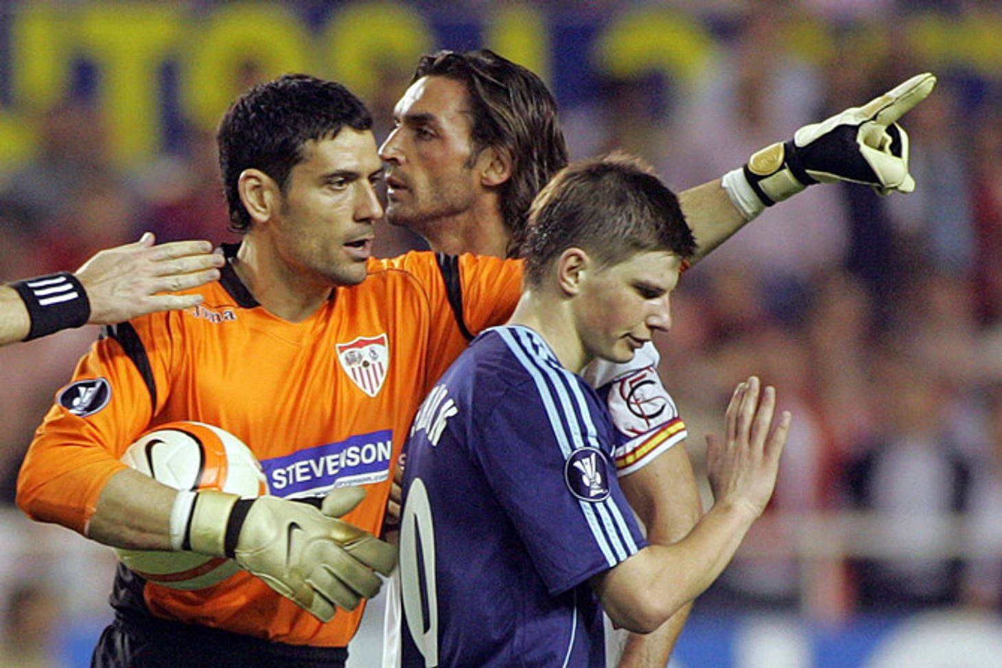 Вратарь «Севильи» Андрес Палоп выгоняет из своей штрафной Андрея Аршавина.