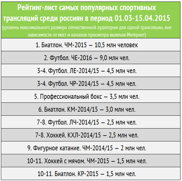 Сегодня одним из главных критериев успешности экономики любых спортивных соревнований и их отдельных участников является внимание телевизионной и сетевой аудитории к соответствующим трансляциям.В начале весны прошли соревнования по ряду популярных видов спорта (чемпионат и Кубок мира по биатлону, отборочный матч футбольной сборной к ЧЕ-2016, футбольные еврокубки и чемпионат страны, чемпионат мира по фигурному катанию, плей-офф КХЛ, гонки Формулы-1) — и их можно сравнить по числу отечественных телезрителей.Итак, самыми популярными в России в первой половине весны 2015 года стали следующие спортивные турниры.