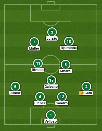 Пальмейрас в момент оборонительных действий располагаетсся: 4-3-3 Ривалдо присоединялся к Амаралу. Галеано руководил обороной. Между тем, Djalminha, Luizão и Мюллер наблюдали за игрой, надеясь, когда наши перехватят мяч, получат возможность действовать впереди