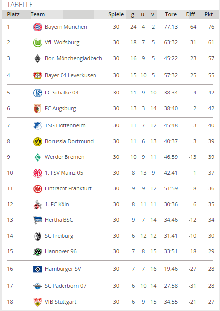 Благодаря «успешным» матчам «Шальке» и «Аугсбурга», расстояние между ними и занимающим 4 место «Байером» теперь исчисляется 13-ю очками. В чемпионате осталось сыграть всего 4 матча, а это значит, что отыграть имеющееся отставание у Роберто ди Маттео и Маркуса Вайнцирля уже не получится. Четыре участника Лиги Чемпионов от Германии известны. Осталось определить кто из тройки «Вольфсбург» «Боруссия» М и «Байер» начнёт следующий сезон на пару недель раньше.