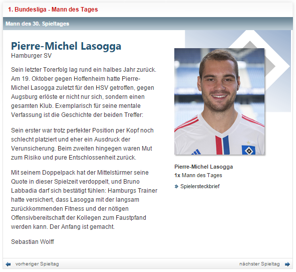 Приятный симптом для фанатов «красноштанников» - волевая победа. Казалось, упущенные 2:0 против «Аугсбурга» приговор. Редко кому удаётся уйти от футболистов Маркуса Вайнцирля при подобном раскладе. Но иногда припёртые к стенке готовы на невозможное. Забил Ивица Олич, для которого этот гол стал первым после возвращения на север Германии. Оформил дубль Пьер-Мишель Ласогга, до этого имевший в своём активе только два мяча, забитые в 7 и 8 турах.