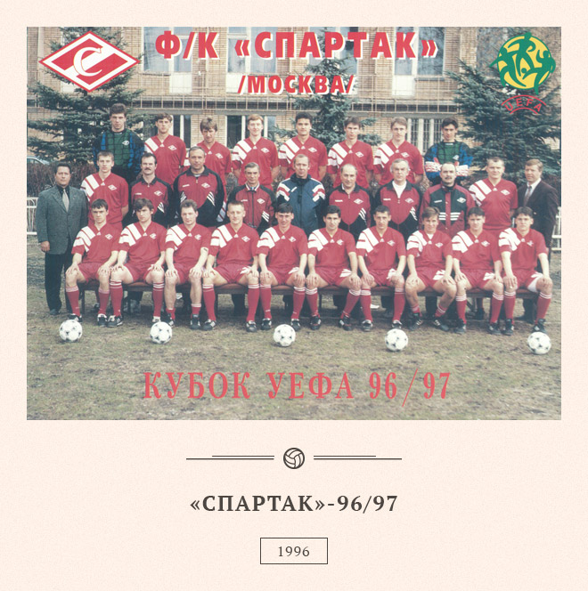 «Спартак» сезона-1996/97. На фото слева-направо: Александр Филимонов, Александр Липко, Андрей Пятницкий, Сергей Чудин, Юрий Никифоров, Егор Титов, Сергей Нагорняк, я (верхний ряд), легендарный администратор команды Александр Хаджи, Александр Ширко, массажист Николай Ларин, тренер, помощник Георгий Александрович Ярцев, главный тренер Олег Иванович Романцев, тренер-администратор «Спартака» Валерий Жиляев, доктор, водитель, Сергей Горлукович, тренер Валерий Гладилин (средний ряд), Алексей Мелёшин, Дмитрий Ананко, Дмитрий Хлестов, Андрей Тихонов, Илья Цымбаларь, Рамиз Мамедов, Владимир Джубанов, Валерий Кечинов, Дмитрий Аленичев, Вадим Евсеев (нижний ряд).
