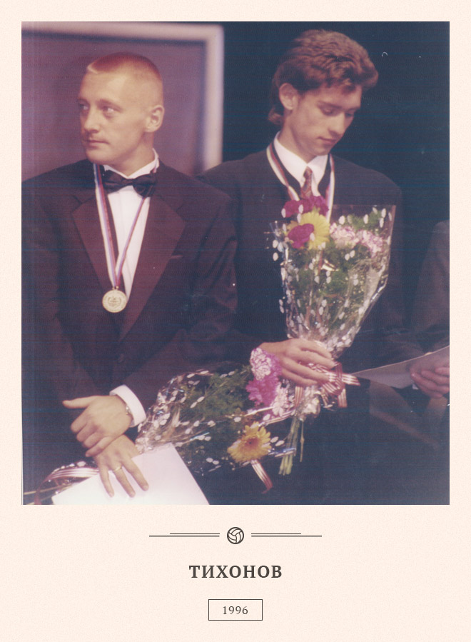 С легендой «Спартака» Андреем Тихоновым на церемонии вручения золотых медалей в 1996 году. «Спартак» в очередной раз стал чемпионом России, а я впервые завоевал золотые медали национального чемпионата. С детства болел и мечтал играть за красно-белых, поэтому был счастлив добиться такого результата именно со «Спартаком». За чемпионскую команду провёл 10 матчей, чаще всё-таки в стартовом составе появлялся Александр Филимонов. К слову, о Тихонове. Он был настоящим профессионалом с большой буквы. Не удивился, что Тихонов играл до 41 года. Он поздновато начал, но закончил позже всех. У нас были и остаются с ним хорошие отношения. С Тихоновым мне сразу вспоминается всем известный случай. Помните, меня удалили в конце матча 1/32 финала Кубка УЕФА с датским «Силькеборгом»? Тогда Андрей ввиду отсутствия замен встал в ворота. Тихонов в том сезоне блистал и находился в такой прекрасной форме, что мог сыграть на любой позиции.