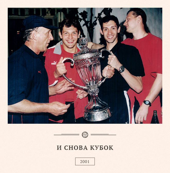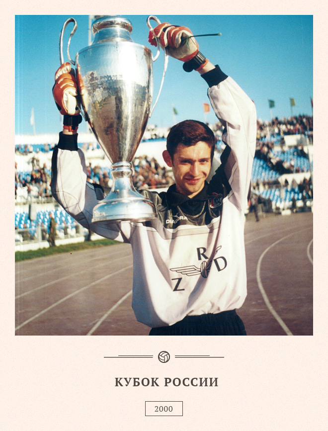 Ещё один финал Кубка России. Стадион «Динамо». Игра против «Анжи». На фото – массажист Владислав Баньков, Дмитрий Сенников и я держим трофей, рядом с нами стоит один из голкиперов команды Платон Захарчук. Кстати, в том знаменитом финале мы забили на последних секундах – удачно стрельнул по воротам соперника Джанашия. Нам удалось сравнять счёт и перевести игру в дополнительное время. В итоге «Локомотив» одержал победу в серии послематчевых пенальти, а я отбил один удар. Нынешнее руководство раздражает, что в то время «железнодорожники» были одной семьёй. Но мы именно на футбольном поле понимали, что «Локомотив» – одна семья. Расскажу один случай. Однажды мы на тренировке что-то не поделили с Сергеем Гуренко, и дело у нас дошло чуть ли не до кулачного боя. Но уже в ближайшей игре Гуренко так бился за то, чтобы в мои ворота не залетел мяч, как будто защищал последнее. Футболисты «Локомотива» быстро разрешали такие конфликты.