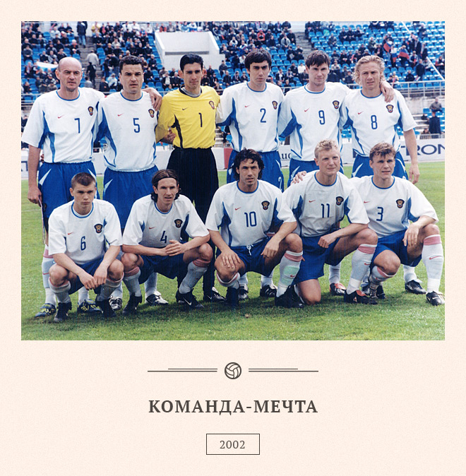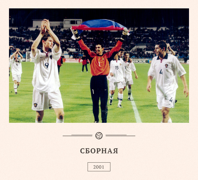 Стадион «Динамо». Отборочный матч к чемпионату мира 2002 года. В последней игре цикла сборная России выиграла у команды Швейцарии со счётом 4:0 и вышла на мундиаль. Сбылась наша мечта. На фото — Марат Измайлов, Егор Титов, я, Сергей Семак, Юрий Ковтун, Дмитрий Аленичев, Игорь Чугайнов. На снимке видно, какие мы – молодые и счастливые. После матча я отобрал флаг у кого-то из журналистов и бегал с ним как угорелый. В тот вечер нападающий Владимир Бесчастных оформил хет-трик ещё в первом тайме, а окончательную точку в игре поставил Егор Титов. Отборочный цикл мы прошли на одном дыхании. Очень скучаю по тому времени. А дебютировал я за сборную в товарищеском матче против сборной США в 2000 году. Тогда я в чемпионате России не пропускал на протяжении 10 матчей подряд и отразил в этих играх три пенальти, что послужило поводом вызвать меня под знамёна национальной команды.