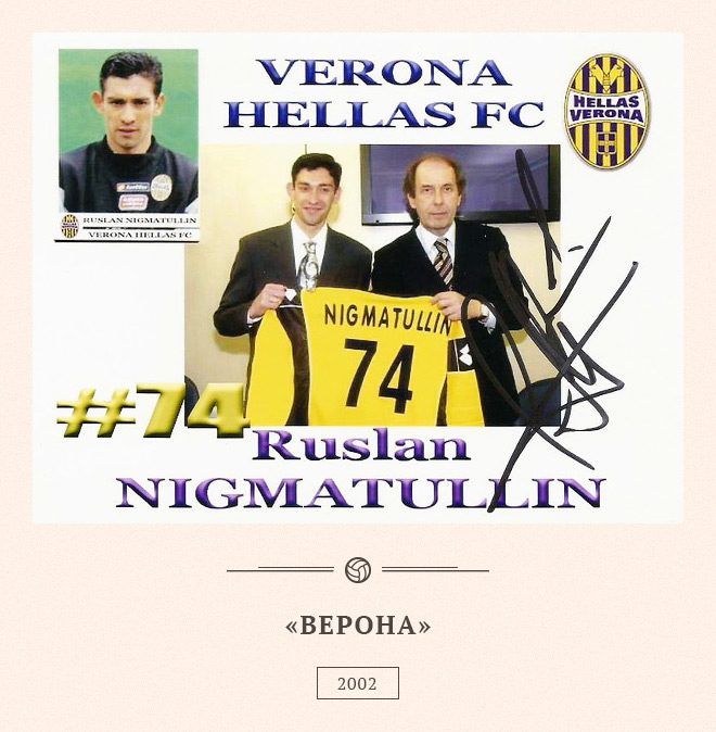 Период выступления за «Верону». Мой автограф на открытке. Моя официальная презентация в новом клубе. На это мероприятие пришло очень много людей. Спортивный директор «Вероны» Рино Фочи представил меня в качестве новичка клуба. Думаю, что если бы была возможность повернуть время вспять, не стал бы уходить в «Верону», а остался бы в «Локомотиве».