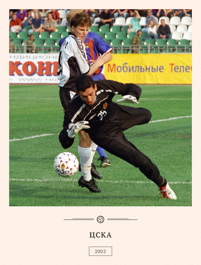 Игра за ЦСКА. Чемпионат России. Матч ЦСКА – «Торпедо». В том моменте отобрал мяч у полузащитника Игоря Семшова. В ЦСКА провёл хорошие полгода. В стан «армейцев» переходил из «Вероны». Получилась так, что итальянская команда вылетела в Серию B и мне нужно было определяться, где продолжить карьеру. На тот момент очень хотелось играть. Тогда получил травму основной вратарь ЦСКА Вениамин Мандрыкин и на меня вышли представители красно-синих. Руководство клуба и Валерий Газзаев были заинтересованы в продлении контракта после первого сезона, но я решил снова отправиться в Италию.