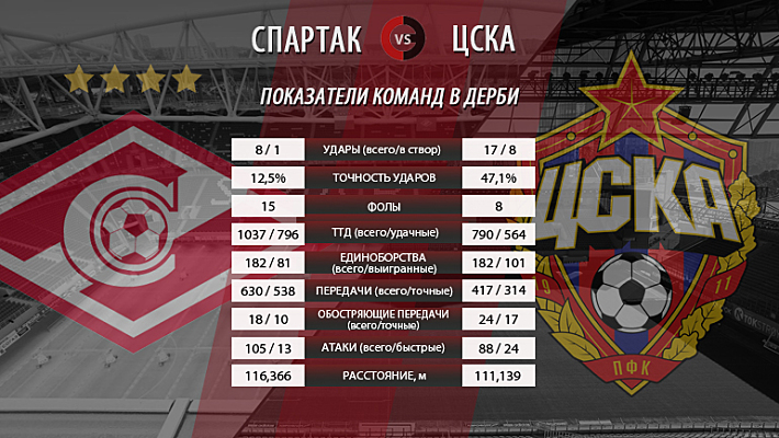 Прошедшее дерби закончилось самым разгромным поражением "Спартака" за 7 лет – как по результату, так и по игре. ЦСКА забил в четыре раза больше мячей, чем "Спартак" попал в створ ворот, выиграл больше единоборств (55% против 45%), почти не нарушал правил – потому что в этом не было необходимости (8 фолов за 95 минут). Но благодаря второму тайму, в котором красно-белые провели большую часть времени в атаке, в некоторых графах у хозяев есть преимущество, которое, впрочем, не должно вводить в заблуждение. По количеству атак у подопечных Мурата Якина превосходство (105 – 88), но из 88 армейских наступлений 24 были быстрыми, а ударами завершились 15 (у "Спартака" – 13 и 8). По точности передач спартаковцы опередили подопечных Леонида Слуцкого на 10 процентов (85% на 75%), но обостряющих передач у ЦСКА 24, из них 17 точных – против 18 и 10 соответственно у соперников. Единственный аспект игры, по которому у болельщиков "Спартака" не может быть претензий к команде, – вброшенные ауты. Их у красно-белых было 23, и все были исполнены точно.