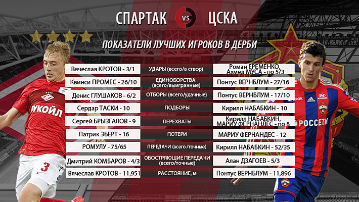 Среди игроков, помимо забивших Романа Еременко, Ахмеда Мусы и отдавшего голевую передачу Алана Дзагоева, у ЦСКА стоит выделить Кирилла Набабкина, который сделал больше всех технико-тактических действий – передач, подборов и перехватов. Защитник не только отрабатывал в обороне, но и поучаствовал в наибольшем количестве атак – 35 (столько уже у Бибраса Натхо). У "Спартака" по большинству показателей лидирует Дмитрий Комбаров.