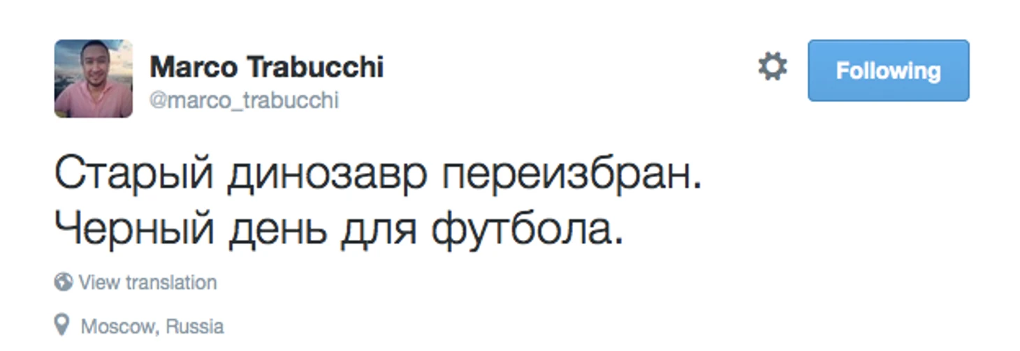 20:47 Агент Марко Трабукки выступил довольно радикально: «Старый динозавр переизбран. Черный день для футбола».