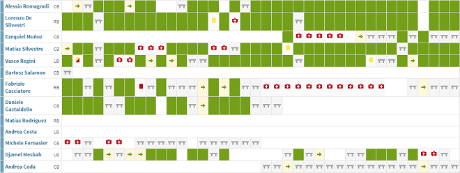 В защитной линии можно увидеть знакомые уже каждому болельщику “россонери” фамилии. В первую очередь, стоит отметить одного из самых перспективных центральных защитников Италии Алессио Романьоли, за которым очень активно этим летом охотится “Милан”. Что же, болельщики миланского клуба могут вздохнуть с облегчением: ни одного пропущенного матча в сезоне и блистательная игра явно говорят в пользу воспитанника столичной “Ромы”. В паре с Романьоли весь сезон в центре защиты провел уже экс-игрок “Милана” Матиас Сильвестре. Вот для сравнения статистика выступлений итало-аргентинца в сезоне 2013-2014, который он провел за миланский гранд: