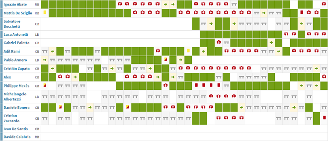 У крайков Иньяцио Абате и Маттиа Де Шильо сезон получился скомканным, особенно это касается первого, ведь именно он по итогам первой половины чемпионата многими экспертами назывался лучшим правым защитником лиги. Маттиа же провёл очередной серый сезон, чем серьезно пошатнул веру в себя миланских болельщиков, но в сборной место сохранил. Соперник Де Шильо по бровке Лука Антонелли пришел в “Милан” лишь зимой, и в целом оставил очень приятное впечатление, заставив позабыть о проблеме на левом фланге обороны команды.