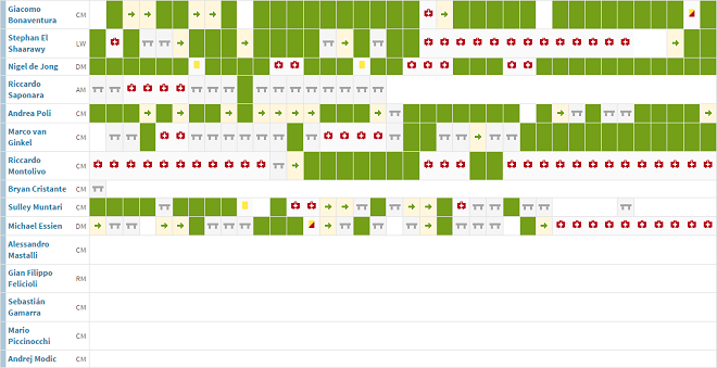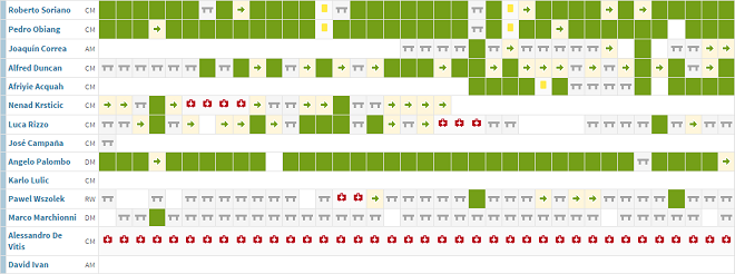 А мы переходим к полузащите – линии, которая во многом определяет игру любой команды. И пусть вас не пугает количество красных значков напротив имени Алессандро Де Витиса: он, как и испанец Хосе Кампанья, никаких шансов влиться в командные построения изначально не имел. А всё потому, что центральную зону весь сезон надежно удерживала пятерка игроков. Первым следует вспомнить Роберто Сориано, который, по слухам, не прочь воссоединиться со своим старым тренером в Столице мод. Центральный полузащитник не пропустил ни одного матча “блучеркьяти”, что вкупе с отменной игрой обеспечило бывшему игроку “Баварии” постоянные вызовы от Антонио Конте в сборную страны.