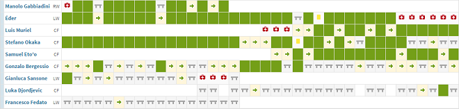 Маноло Габбьядини, прекрасно отыгравший первую половину сезона, отправился покорять Неаполь, вечно талантливый Луис Муриэль, присоединившийся к команде в то же межсезонье, так и остался талантливым, а с недавних пор дагестанец Самуэль Это’о в очередной раз доказал, что он еще что-то может. Стефано Окака Чука забил несколько по-настоящему важных мячей, но, такое впечатление, больше времени потратил на обдумывание своего будущего.