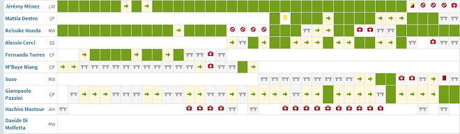 Наконец дошли и до игроков линии атаки. Лучшим бомбардиром команды с 16 мячами стал француз Жереми Менез, опять же подметим, что, по слухам, любимый игрок самого Сильвио Берлускони пребывал весь сезон в превосходной форме, лишь в конце подпортив впечатление от своего выступления нелепой дисквалификацией.