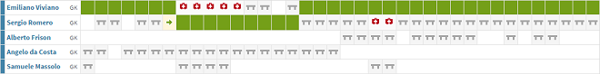 Начнём, как и положено, с вратарской позиции. Основной страж ворот команды Эмилиано Вивиано пропустил из-за повреждений 5 матчей, но у него за спиной был отличный сменщик в лице финалиста чемпионата мира в Бразилии в составе сборной Аргентины Серхио Ромеро, который пропускал матчи и того реже.