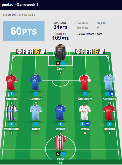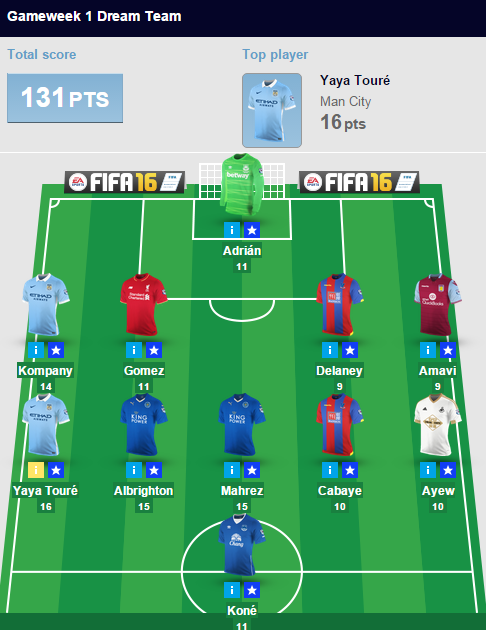 От подопечных Тони Пулиса ждали серьезного сопротивления «Манчестер Сити», однако «горожане» вынесли «Вест Бром» вперед ногами. Невзрачный прошлый сезон сбросил ценник на Туре до 8.5, и в первом же туре ивуариец набирает 16 очков. В прошлом сезоне Компани ни разу не забивал и ни разу не ассистировал — ценник упал до 6.0, и Венсан сразу разразился голом и клиншитом и набрал 14 очков.