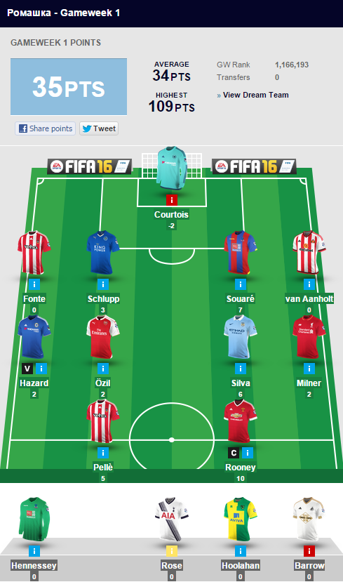 Теперь о грустном. 1-й тур лично для меня вышел не самым приятным. Есть положительные моменты вроде ассистов Шлуппа и Суаре и результативных очков обоих нападающих, но больше, конечно, отрицательного. Ван Анхолт и Фонте приносят по 0 баллов — обратная сторона стратегии дешевых защитников во всей красе. Про Куртуа аккуратно промолчу. Азар и Озил свое еще доберут, к Сильве вопросов нет. А вот в Милнере начал слегка сомневаться. Очень надеюсь на быстрое восстановление Роуза, ибо в ближайших матчах он мне очень нужен.