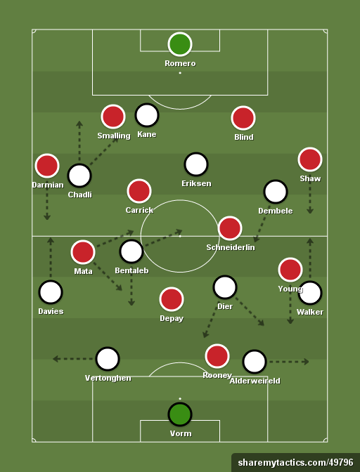 Тем не менее, Дайер и Бенталеб в этой встрече старались безмерно; нехарактерно неряшливый Бенталеб часто пренебрежительно терял мяч в центре поля, в результате чего Манчестер Юнайтед имел возможность капитализировать эти ошибки благодаря своему высокому прессингу. Также, у них обоих проявлялась бесполезная тенденция оттягиваться глубже и ближе к своей центральной защите, когда кто-то из них был с мячом, тем самым провоцируя манкунианцев идти вперед, и в то же время ограничивая пространство для Алдервейрелда или Вертонгена, чтобы те могли двигаться вперед к середине поля, часто заставляя Тоби переключать игру налево на Шадли или на Эриксена.