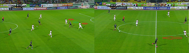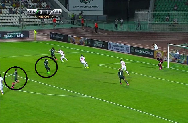 На скриншоте справа провалился уже Глушаков, и у «Краснодара» отличная возможность организовать контратаку. Дмитрий Комбаров вынужден играть не со своим оппонентом, а Ромуло вынужден срывать наступление соперника. Арбитр должен был показывать за этот фол жёлтую карточку, но пожалел бразильца.