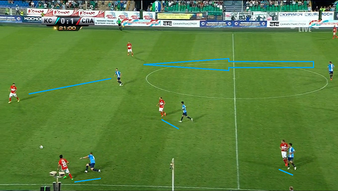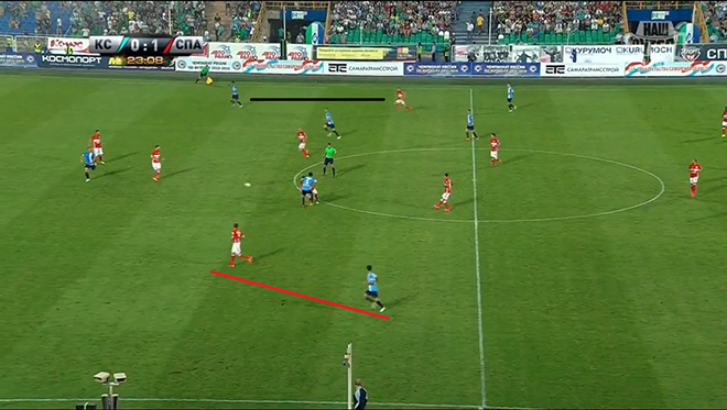 Во-первых, выход из обороны в атаку. Тренер «Спартака» не любит простые забросы вперёд, а при двух «шестёрках» и одной «восьмёрке» проходить центр поля через пас легче. Прессинговать, пусть и робко, красно-белых пытались и «Крылья», а ЦСКА сделает это в разы качественнее. На скриншоте ниже видно, что если бы центральный полузащитник Самары не побоялся пойти в прессинг, то в лучшем случае «Спартаку» пришлось бы переходить в атаку неподготовленным забросом вперёд.