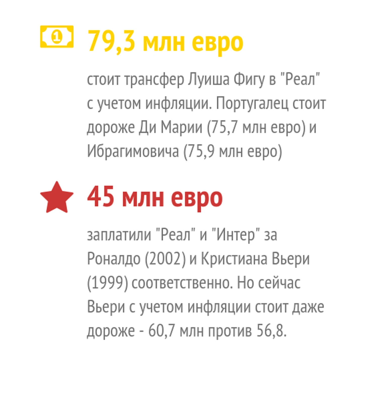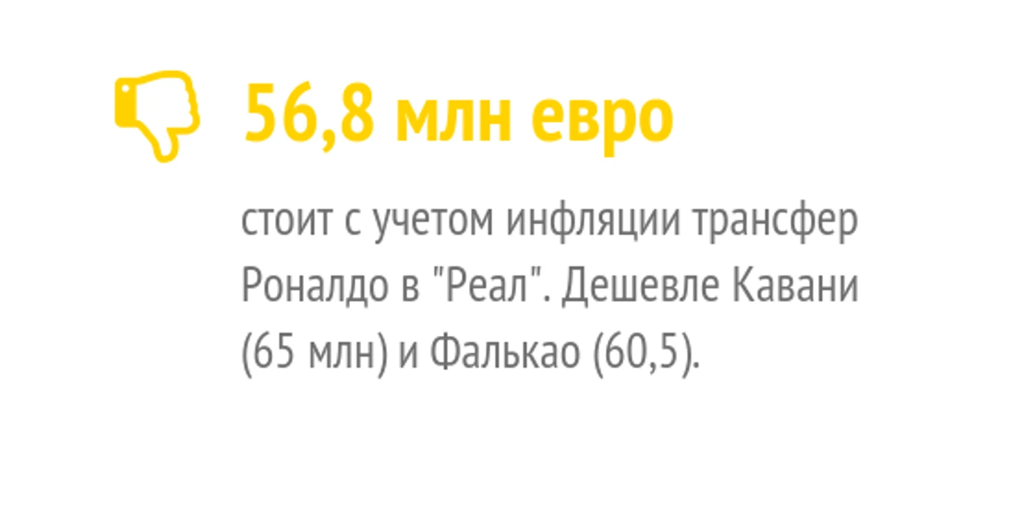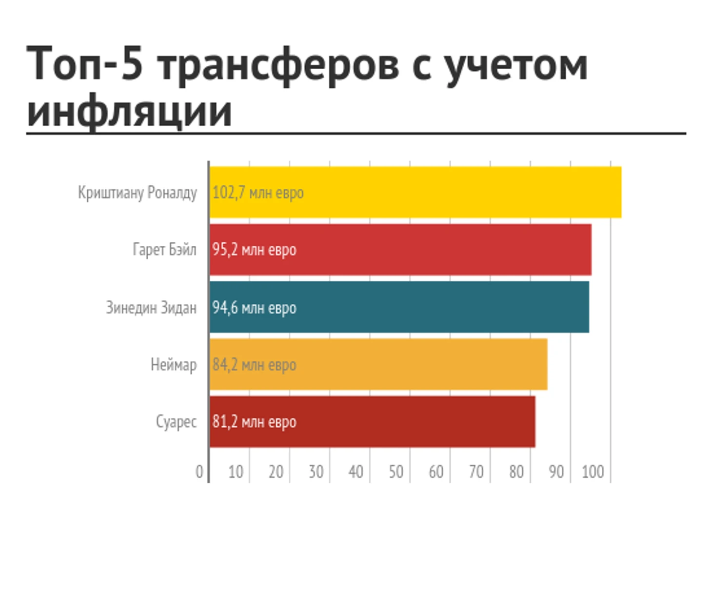 С учетом инфляции становится интереснее: в тройку сразу проходит Зинедин Зидан, за которого в 2001 году заплатили 73,5 миллиона евро. Сейчас эта сумма превратилась в 94,6 миллиона.