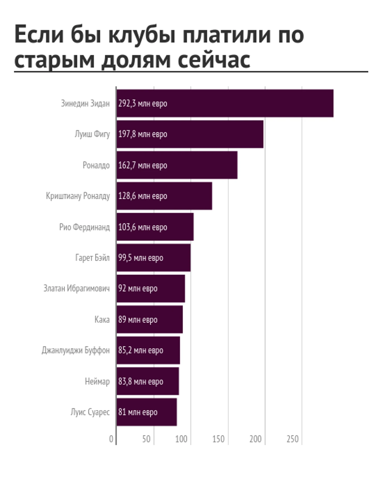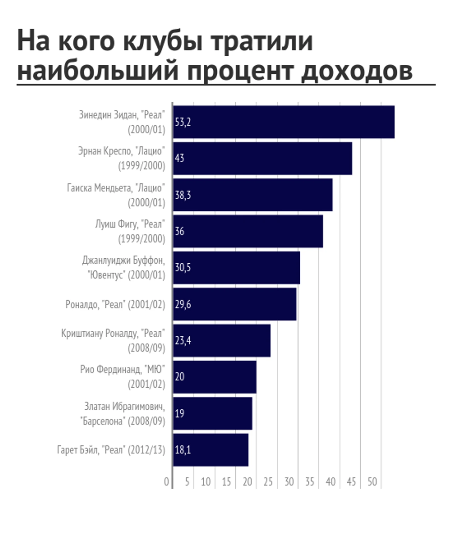 Здесь абсолютным королем признается Зинедин Зидан: за него «Реал» в 2001 году заплатил фактически половину суммы, полученной из всех источников по ходу сезона-2000/01.