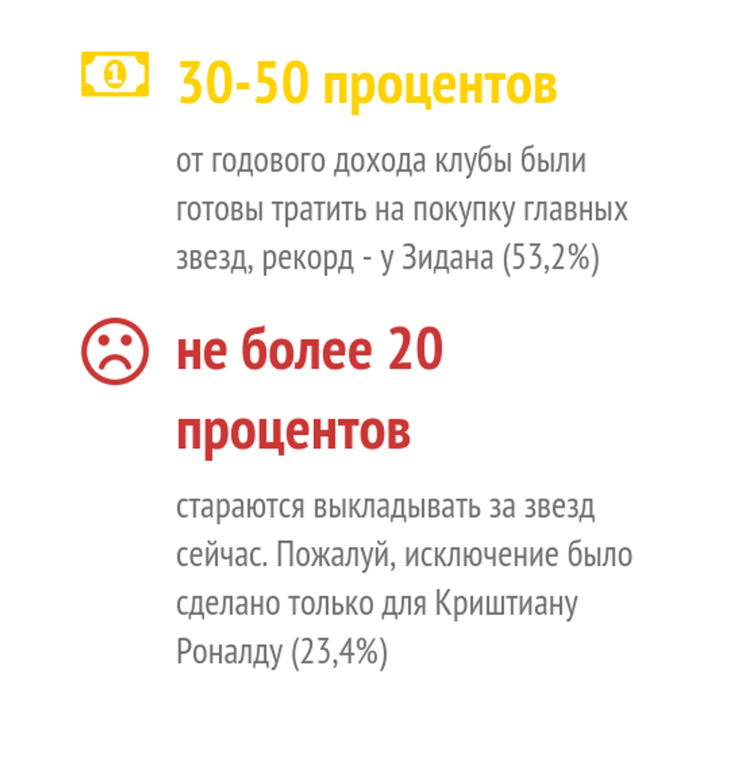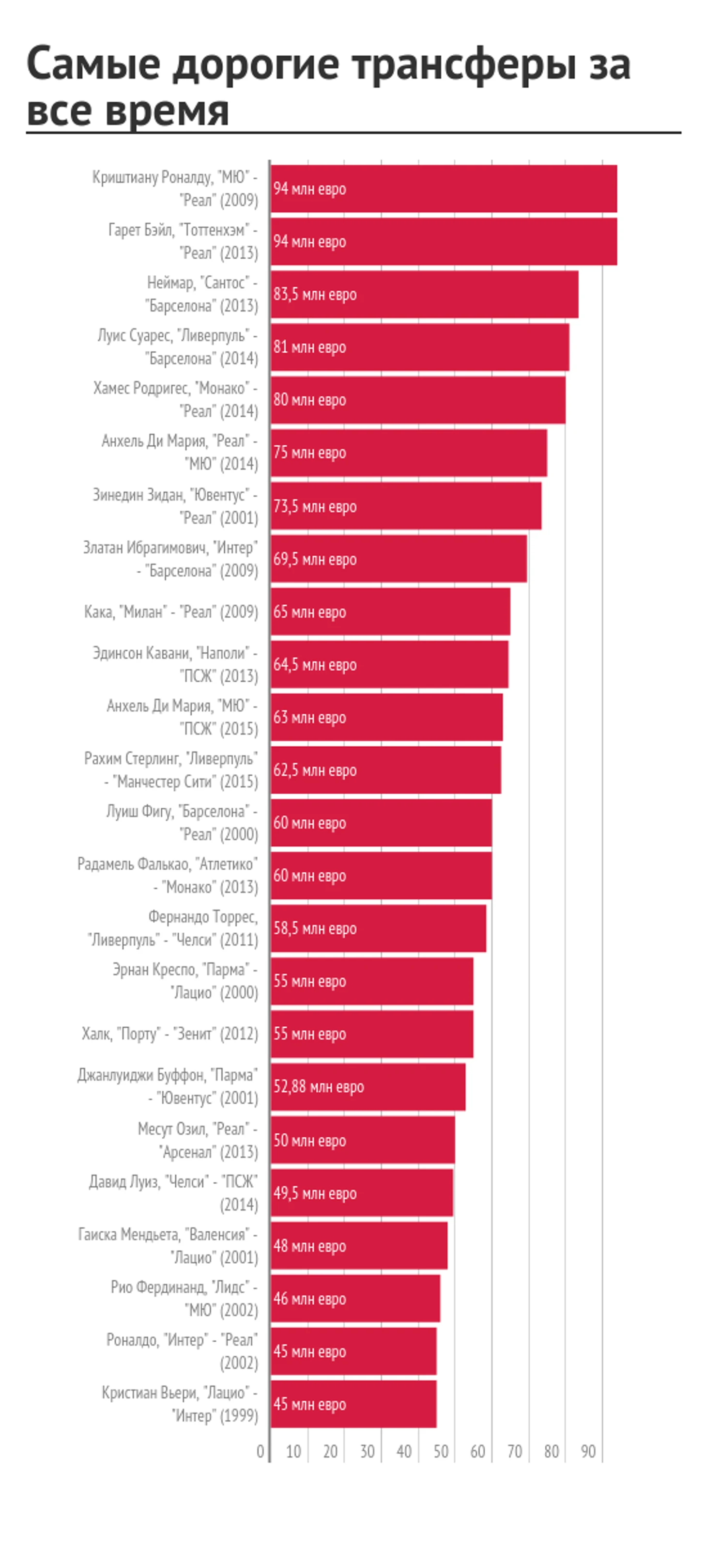Почему в верхней части рейтинга только старые трансферы? С резким увеличением доходов во второй половине нулевых европейские клубы стали больше тратить и на развитие собственных брендов, расширяя влияние не только в родных странах, но и на других континентах. Поэтому удалось подрезать долю расходов на трансферы, не особо ущемляя свои интересы.
