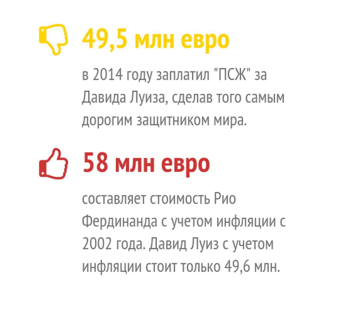 Забавнее всего наблюдать за цифрами, которые в привычном рейтинге Transfermarkt выглядят примерно одинаковыми. Например, Давид Луиз (49,5 млн евро, 2014 год) и Рио Фердинанд (46 млн, 2002 год).