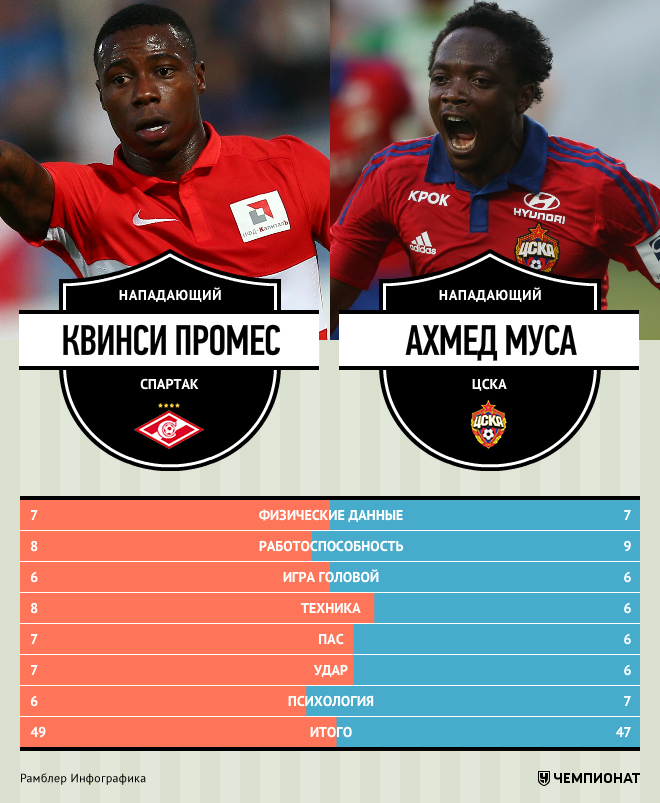 В преддверии дерби «Спартак» — ЦСКА наш обозреватель Константин Генич сравнивает нападающих команд — Квинси Промеса и Ахмеда Мусу.