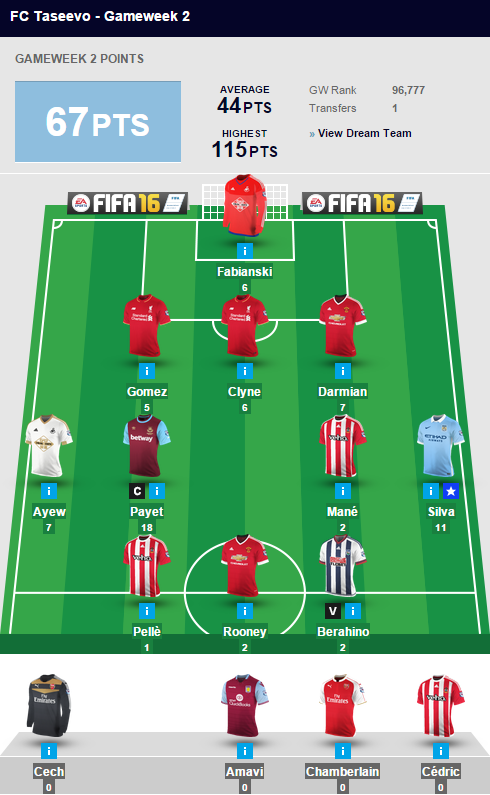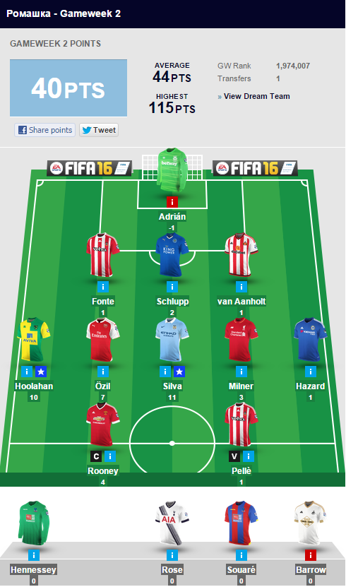 А вот Руни я очень необдуманно взял и отдал повязку на 2 тура. Мог этого избежать, слышал ведь болельщиков МЮ, которые предупреждали, что Руни тяжело в сезон входит. Если в FPL у меня еще во втором туре в принципе не оказалось игроков, принесших больше очков, чем Уэйн со своими двумя (Жиру не в счет, после первого тура и непонятками с его конкуренцией с Уолкоттом я бы точно не отдал ему повязку), то вот на Спорте таковых было несколько. И тут я реально прокололся.