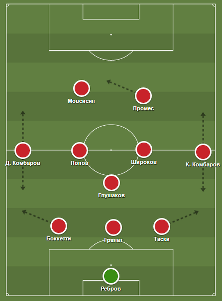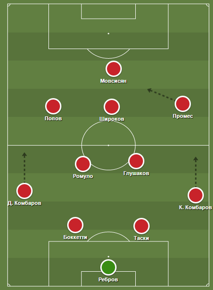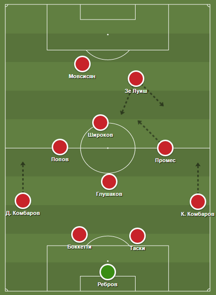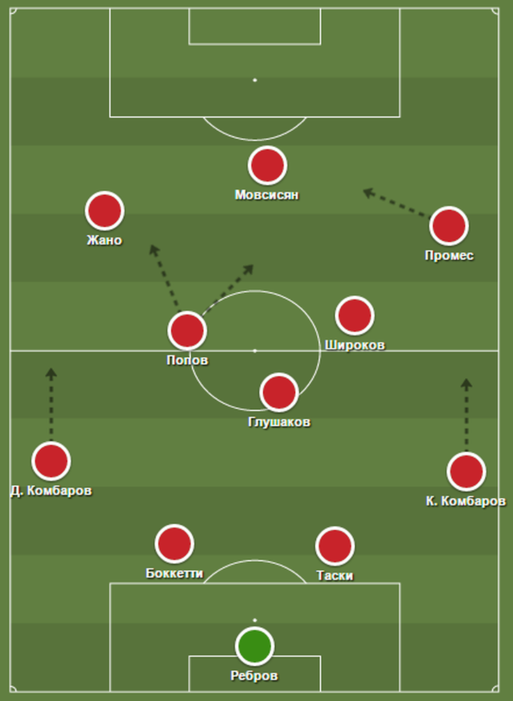 Зе Луиш часто смещался вглубь, уводил защитника и оставлял Мовсисяну больше свободного пространства, а Промес атаковал из удобной позиции правого полузащитника. Возможно, Аленичев применил эту расстановку исключительно исходя из соперника – «Амкар» играл с тремя центральными защитниками, и Мовсисяну в любом случае нужна была поддержка впереди.