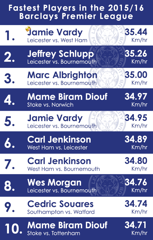Забавный факт: Варди, Олбрайтон и Шлупп развили максимальную скорость среди всех игроков Премьер-лиги. Занятно, что восьмым в этом рейтинге стал еще один игрок «Лестера» – Уэс Морган, которому не помешали ни габариты, ни лишние килограммы.