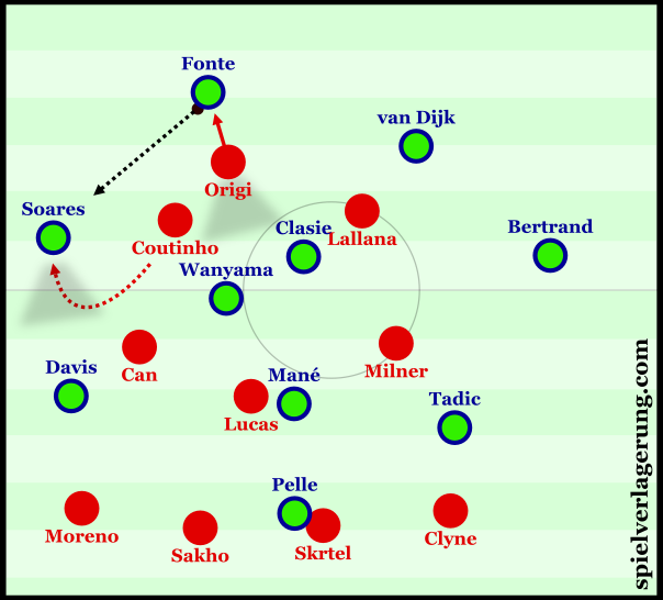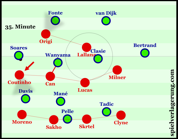 При атаке Саутгемптона по левому флангу обороны Ливерпуля Коутиньо опускался на позицию крайнего полузащитника, а к нему поднимался на позицию инсайда Джан: