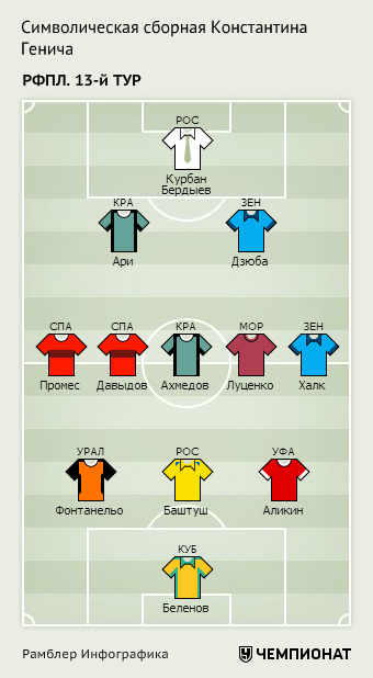 И ещё одного нападающего отправим в середину поля. Сборная у нас всё-таки виртуальная. А мест в атаке на всех форвардов не хватит. Давыдов вышел в дерби на замену — забил и отдал голевую передачу. Тут никаких вопросов. Главное — не перехвалить нашего «маленького Месси». Подобная история уже случалась, когда Леонид Федун назвал его «нашим Месси». После этого Денис перестал прогрессировать. Но вышел он, конечно, очень здорово. Хорошо сыграл и Зуев, появившийся во втором тайме, но сборная не резиновая. Отмечаем самых достойных. Давыдов сделал просто фантастическую передачу на Промеса в компенсированное время и отправил себя в состав символической сборной 13-го тура.